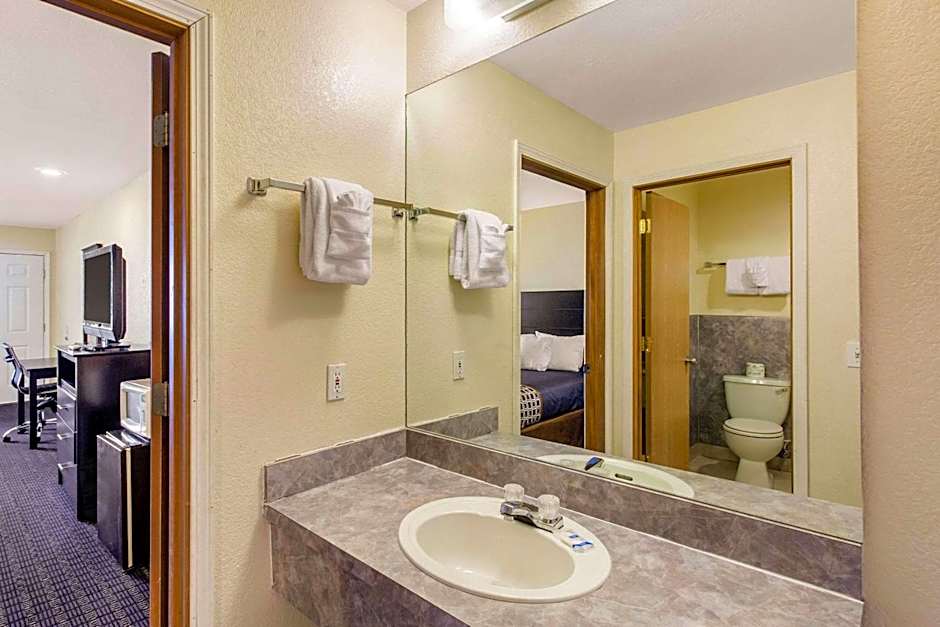 The family room is furnished with a desk and a seating area. The unit has 2 beds.